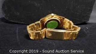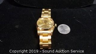 Item Description: Starts to run and then stops, probably just needs cleaned, some slight wear to the band. Serial 1520. Case is marked 18K, did a scratch test, felt hard, held up to 18K acid, but did not look like gold to me. Cannot authenticate but looks like the real thing. ATTN: We are not jewelry experts or appraisers, please use your own judgement when bidding.