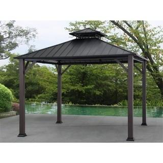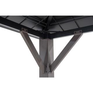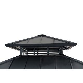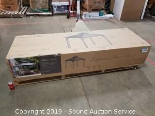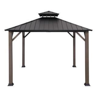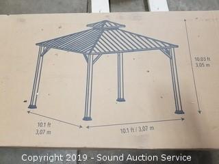 Item Description: Heavy duty steel frame with matte black powder coated top & wood grain posts. (Exterior: 10.925-ft x 10.925-ft; Foundation: 10-ft x 10-ft). $1,098.00 retail value. #878762, Model L-GZ1150PST-A.