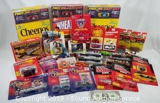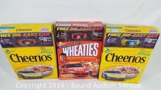 Item Description: Wheaties and Cheerios cereal boxes with die cast cars (one of the Cheerios is empty, others are full), Semi-trucks, stock cars, Top Fuel drag car, and more.