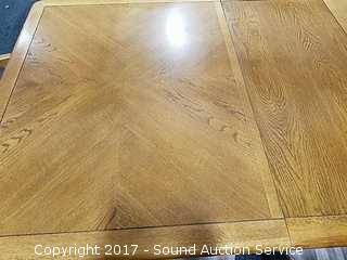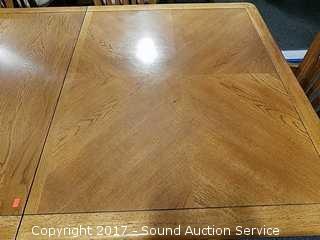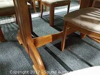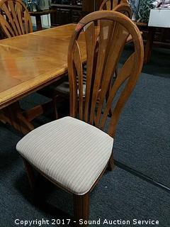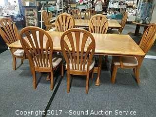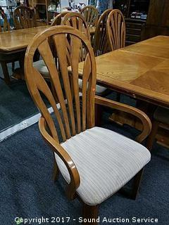 Comes with 6 chairs 2 are Captains chairs and 1 leaf. Approx. 30" tall, 44" wide, 66" long plus 18" with leaf.