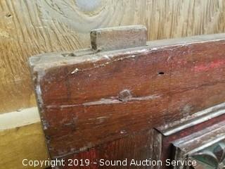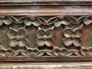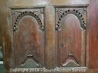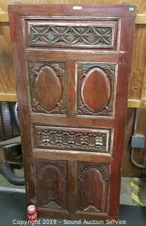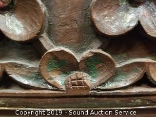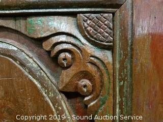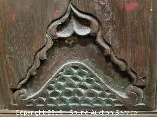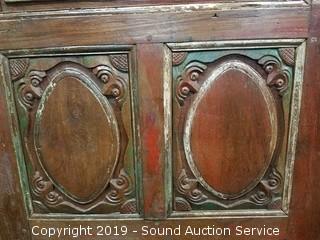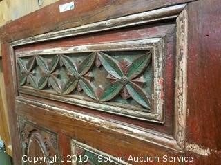 Item Description: Looks to be hand carved, no steel, pinned together with wood dowels. Old oriental red and green paint. 57" x 27" x 1-1/4". Has a price tag of $399, reduced to $199.