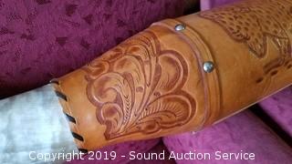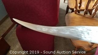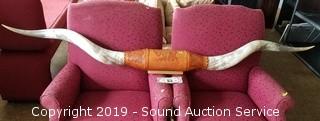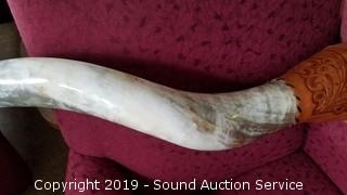 Item Description: Overall approx. 80" L. Has a tooled leather mount. Each horn is approx. 30" L.