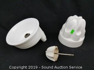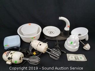 Item Description: Dormeyer & Kenmore mixers, with mixing bowls, juicer attachment & snack plates. The Dormeyer mixer is broken from the stand.