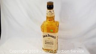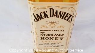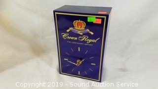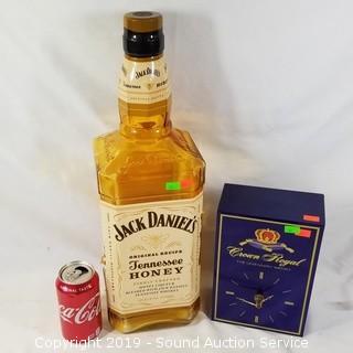 Item Description: Jack Daniels bottle is Tennessee Honey, glass, 19" x 6" x 6". Crown Royal clock is tin, 8" x 6" x 3.5".