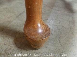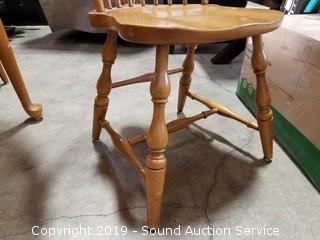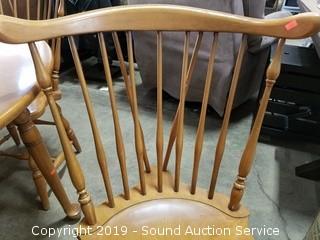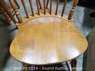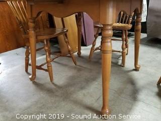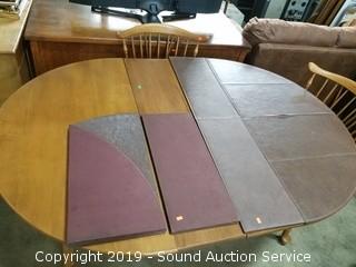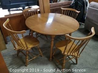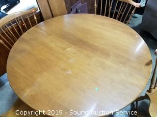 Item Description: Comes with 4 Windsor Spindle back chairs. Table has (2) 10" leaves and felt cover. 30" H x 48" Dia. Chairs are 34" x 17" W x 18" to seat. Some wear to the finish mainly around the feet, table top is in excellent condition, beautiful finish.