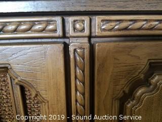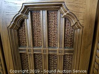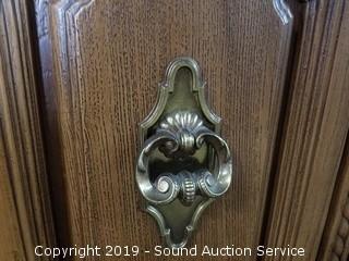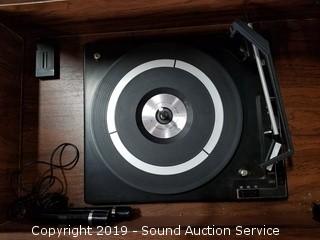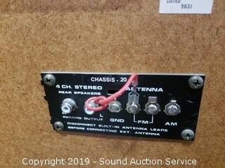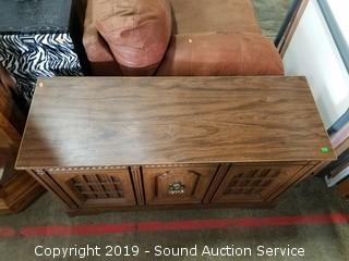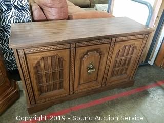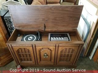 Item Description: Radio works, unable to test the 8-Track, was able to get the record player to play sound with some assistance had to manually spin it and then it started to spin on its own but the needle would skip across the record. 26" H x 44" W x 15-1/2" D.