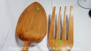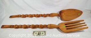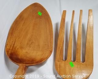 Lot #0130: Pair of Lg. Carved Wood Fork & Spoon Decor