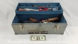 Item Description: Screwdrivers, wrenches, pliers, riveter, level & more. Toolbox has someone's name written on it in sharpie.