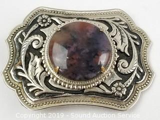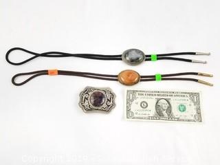 Lot #0103: 2 Polished Stone Set Bolo Ties & Belt Buckle