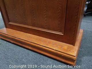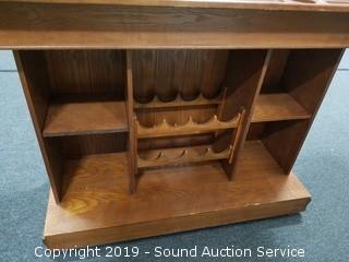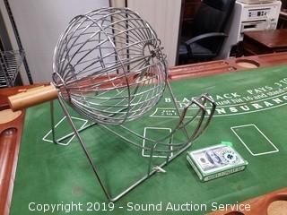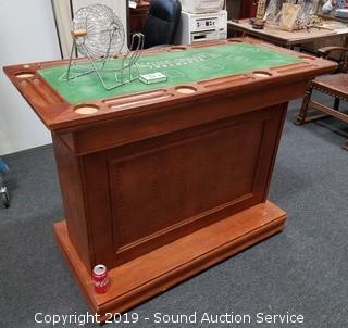 Item Description: Has reversible & interchangeable Roulette & Black Jack gaming table tops, with cup holders Playing cards & Bingo ball dispenser. Bas has been repaired, some stains in the felt. 40" H x 53" W x 25" D.