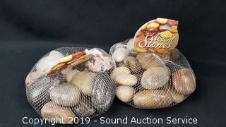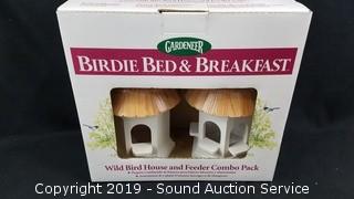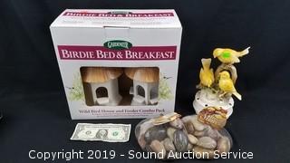 Item Description: NIP Birdie Bed & Breakfast, ceramic bird statue, and 2 bags of polished river rocks.
