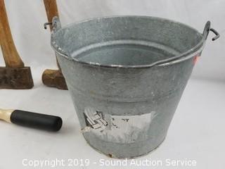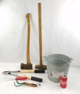 Lot #0133: Galvanized Pail, Sledgehammer, Axe & Garden Tools
