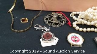 Item Description: Avon gold plated necklace with pendant, chain necklaces, faux pearl necklaces, rings, MOP Army Navy mother pin, medals, and more.