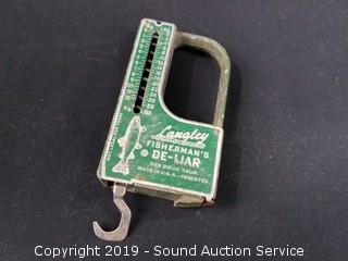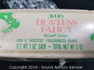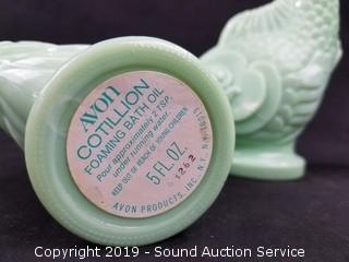 Item Description: Shell Oregon road map, fisherman's 28lb spring scale, Bubble-Up drink can, Avon Jadeite after shave fish bottles & soap dish.
