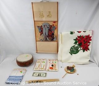 Lot #0068: Tribal Drums, Chop Sticks, Scroll Art & More