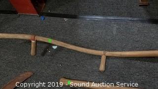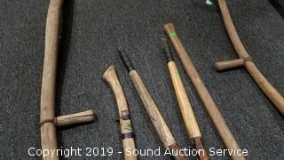 Item Description: All have that rustic look. One axe is double bit 36" long, other is 27" long, loppers are 28", scythes have 16" and 24" long blade.