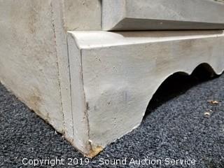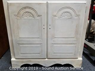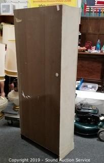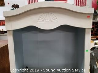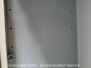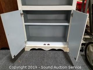 Item Description: One shelf, not adjustable. Has a place for an adjustable shelf. Cord hole has been cut in the back. No door pulls on the lower cabinet. Finish is dirty. Approx. 74" H, 30" x 12".