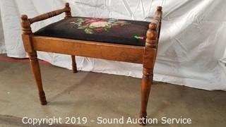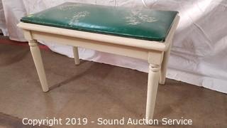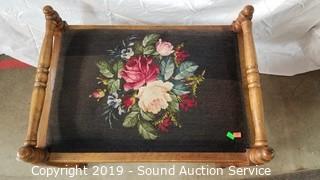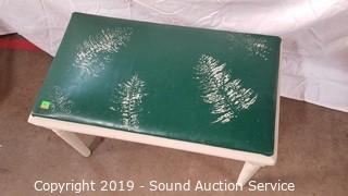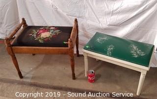 Item Description: One is floral needlepoint. 19" x 23" x 16". Other is vinyl seat, white painted with a fern leaf print. 15" x 23" x 13".
