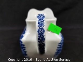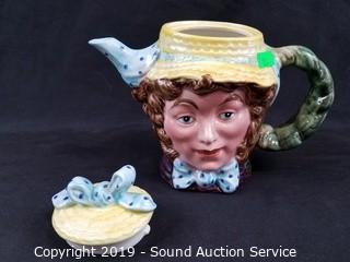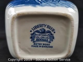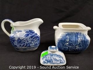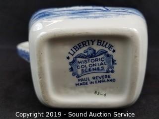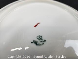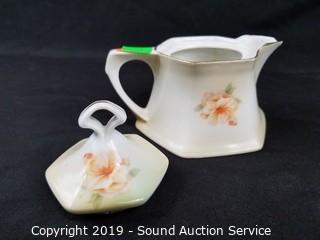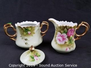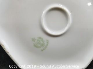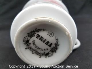 Item Description: 4 Trisa Cups with 3 saucers, Dolly Varden 1203 teapot, hand painted Lefton gold trim cream & sugar, RS Germany creamer, Paul Revere Liberty Blue cream & sugar made in England, and German plate, can't make out the makers mark.