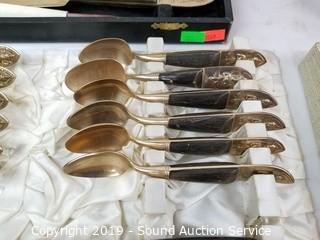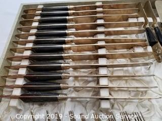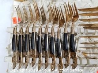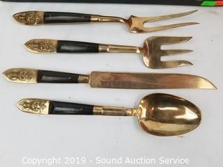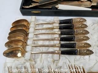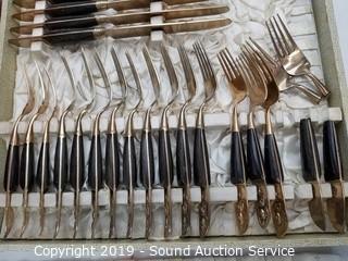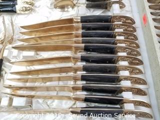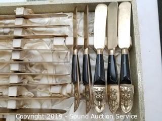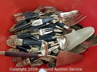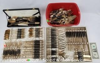Item Description: 12 long spoons, 15 short spoons, 12 flat spoons, 17 tiny spoons, 12 cocktail forks, 1 larger cocktail fork, 14 large forks (2 are broken), (3) 4-prong short forks, (10) 3-prong short forks, 11 steak knives, 11 butter knives, (16) 3-prong forks, 2 pie/cake servers (one is not part of the set), 1 scalloped small spoon, 1 oval small spoon, 4pc. carving set, 12 spread knives, 1 spread knife with prongs, twisted handle serving fork spoon and salad spoon, and one handle. Comes with organizers and cloth cases.