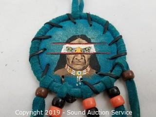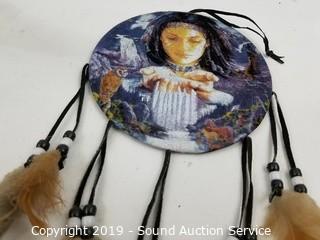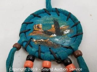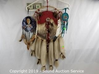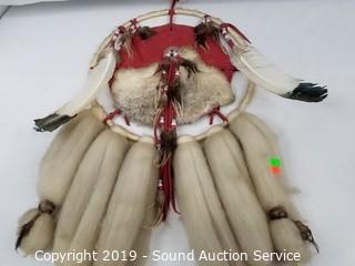 Item Description: The largest one is a Mandela made with wool, leather, fur, beads & feathers. 27" H x 13". The Mandela symbolizes the Indian shield for good luck. Were originally war shields made of leather, wool, fur and feathers.