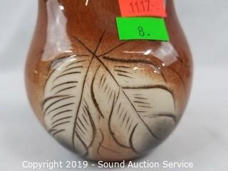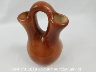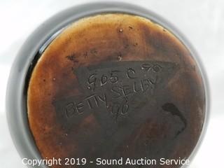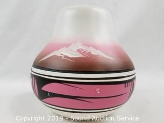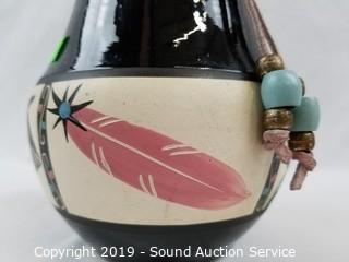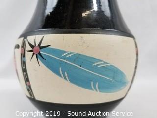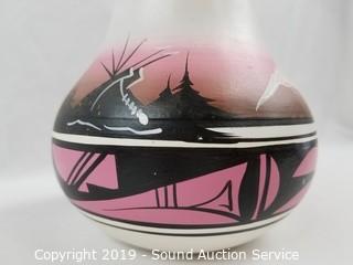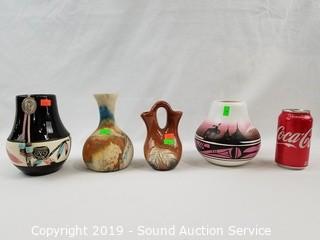 Item Description: Includes a Nemadji Pottery vase, signed Betty Selby 1990 vase, beautiful pink "End of the Trail" painted vase, & other no signature 2 bud vase with images of feathers. All approx. 6" tall.