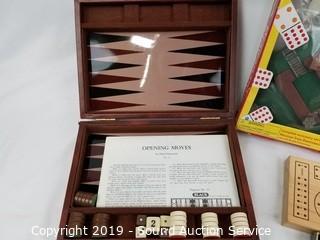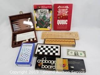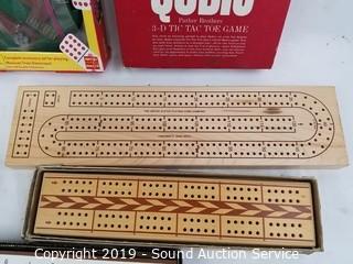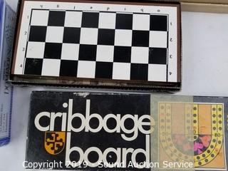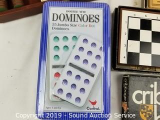 Item Description: 3 cribbage boards, travel chess set, travel backgammon, NIP jumbo size colored dot dominoes, cubic 3D tic toe game, and Mexican train game set.