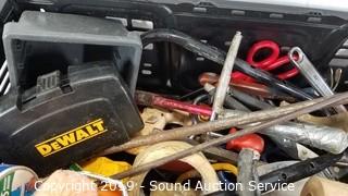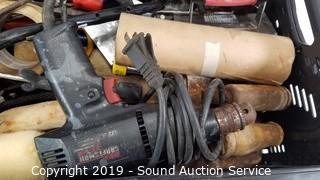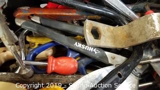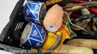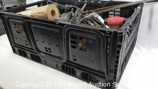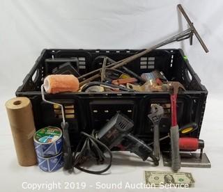 Item Description: Paint rollers, Craftsman drill, hex key wrenches, water valve shut off wrench, pliers, crow bar, bits, adjustable wrenches, scrapers, and more. Crate is collapsible, 9.5" x 16" x 23".