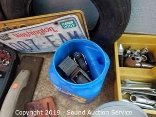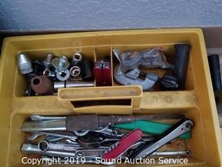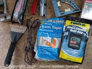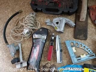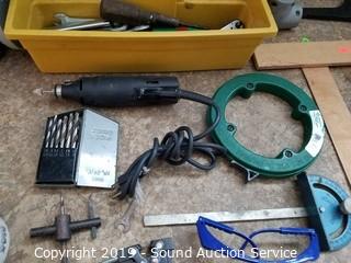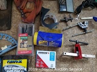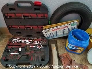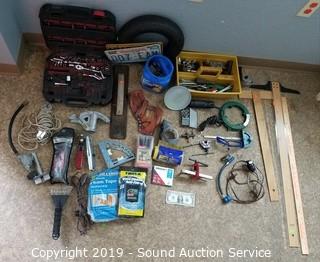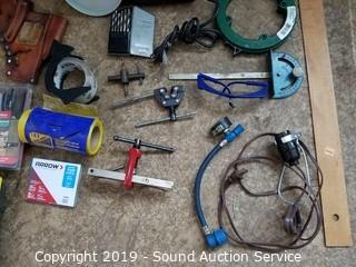 Item Description: Wheelbarrow tire, steel fish tape, tool tote with wrenches, sockets, multi-tools, pipe cutter, ratchet, casters, wood float, leather cordless drill holster, square, LP gas regulator, pulley, flaring tool, yard stick, T-squares, and more.