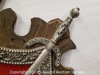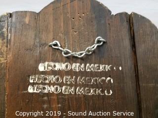Item Description: Made from carved wood and cast metal. Marked made in Mexico on the back. 40" H x 28" W.