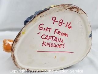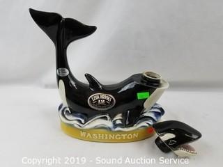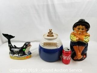Item Description: Stoneware cookie jar signed "Carley 1990", Hand painted by Arnel's boy crouching cookie jar, and Erza Brooks 1972 Orca whale liquor bottle. Cookie jars approx. 9.5" to 13" H.