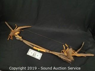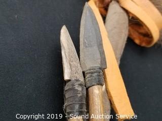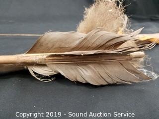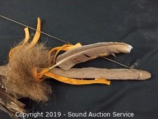 Item Description: Bow and arrows are both hand made, the arrows have feather flights with stone arrowheads, bow is leather wrapped with fur and feathers, sinew sting.