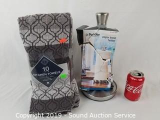 Lot #0219: 10pk Kitchen Towels & Polder Paper Towel Holder