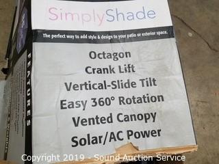 Item Description: Crank lift, vertical slide tilt, vented canopy, solar AC power. 8'ft 7" H x 10'ft 9" Dia. 85sq. ft. of coverage.
