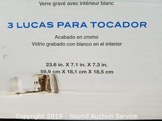Item Description: Previously installed, has mounting bracket & hardware. Shades are etched glass white inside, all intact, one socket is broken will need replaced. 23.6" x 7.1" x 7.3". #0616032.