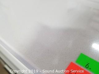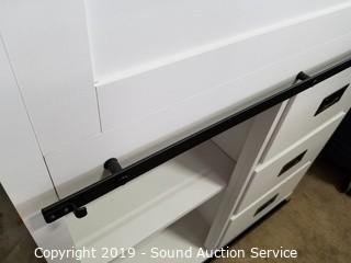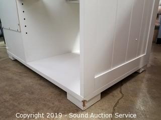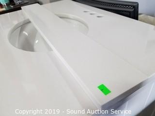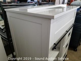 Item Description: Missing the slide door. Tile top with back splash & porcelain sink. Some paint chipping off back left bottom. Otherwise like new, doesn't look like it has been installed. 35" H x 30" W x 20" D.