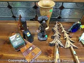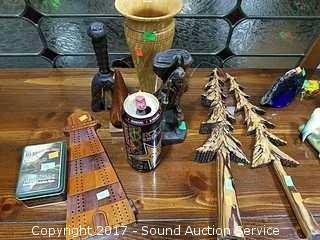 The Fireplace Shop Trees, Handcrafted Roger Wayman Wooden Vase, Bell, 10,000 Villagers Sculpture, Woodcraft Cribbage Board & Moosehead Beer Playing Cards.