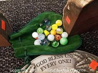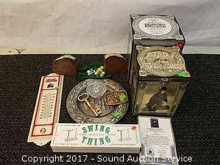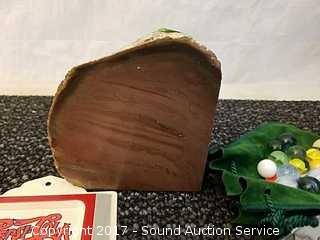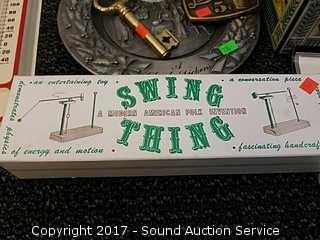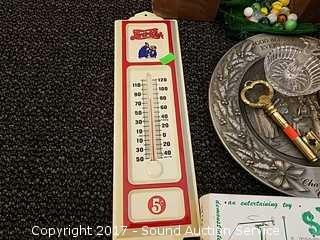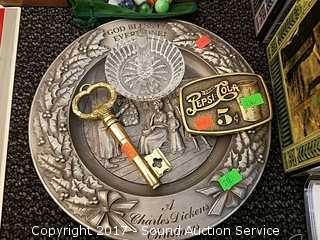 Includes: Pepsi-Cola belt buckle and thermometer, collectors plate, large skeleton key, Swing Thing game, large geode, Charlie chaplin musical jack in the box (doesn't seem to work right) and marbles.