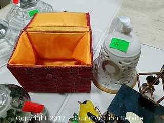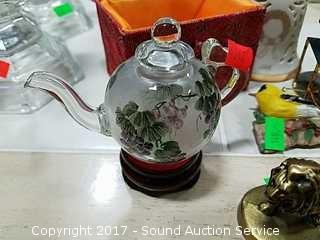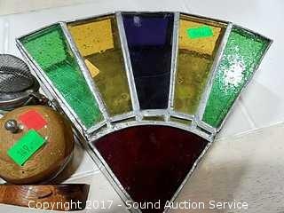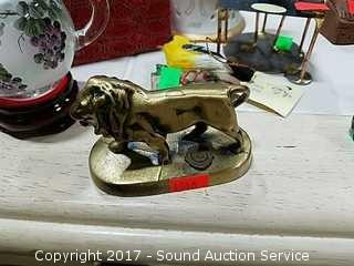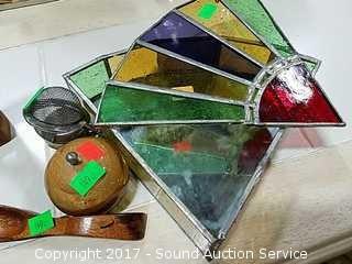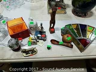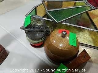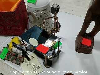 Includes: Reverse painted teapot, Lions International brass lion, Fisher Wildlife ornament, stained glass trinket box and more.