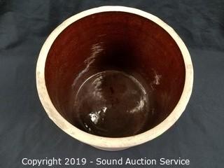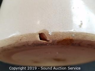 Item Description: 9" H x 9.5" dia. In good condition, glazed inner, don't see any damage, but has a flaw on the bottom edge.