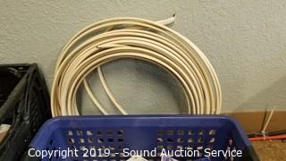 Item Description: Electrical wiring, pipe wrench, shears, pneumatic grease gun, wrenches, sockets, hack saw, respiratory masks, floats, galvanized wire, nails, sandpaper, and more. Crate included, 11" x 23" x 16". Basket is 7.5" x 17" x 12".