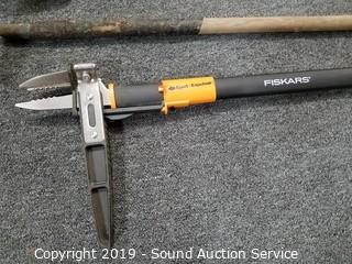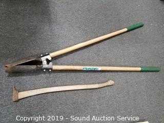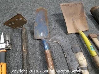 Item Description: Square shovel, clam shovel, post hole digger, hoe, bill hook axe, weed puller & Log hook?