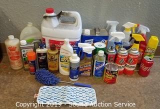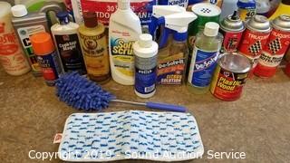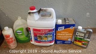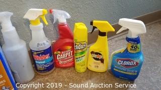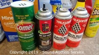 Item Description: All have some contents. Includes: CLR, 30 second outdoor cleaner, mineral spirits, Clorox cleaner, Comet, Beeswax wood preserver, and more.