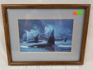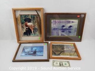 Item Description: Native orca whales, Richard Clifton duck print, A/S bird dog pheasant hunting photo, and A/S photo. Approx. 9" x 11" to 17" x 13".