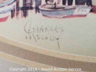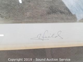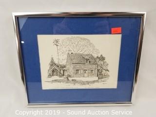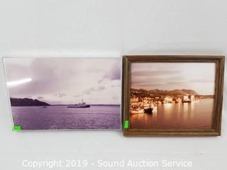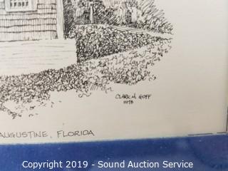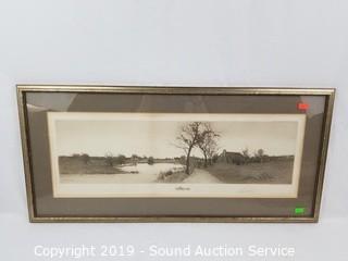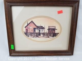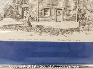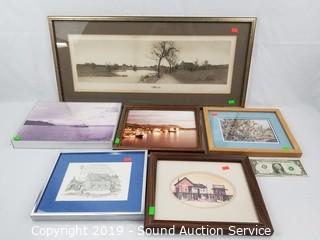 Item Description: Clark Goff Schoolhouse print, Charles Mulvey? print, A/S farm scene etching print, driftwood print, tub boat photo & E.J. Field sketch print. Approx. 9" x 10" to 27" x 13".