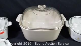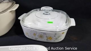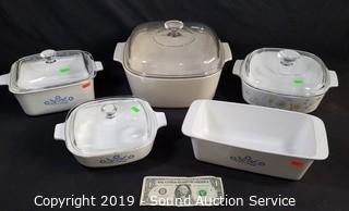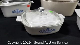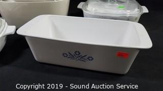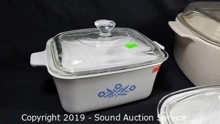 Item Description: All but the loaf pan have lids. 3 are Blue Cornflower (7" x 5.5" x 3", 1QT, and 9" x 5" x 3"), 5 liter roaster, and daisy print 2QT casserole.