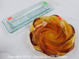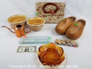 Item Description: Clogs are signed by artist, made in Holland, dated 1953, hand carved. Pottery bowls are signed by artist. Also includes: vtg. sewing bag, glass dishes, and copper watering can.