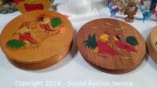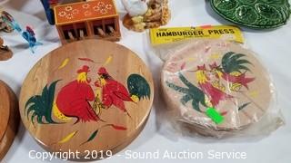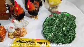 Item Description: Deviled egg tray, patty presses, knife block, wood, ceramic, art glass, terracotta and real feather figures. Approx. 4" to 12" H.