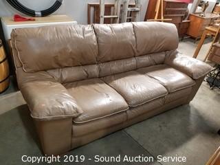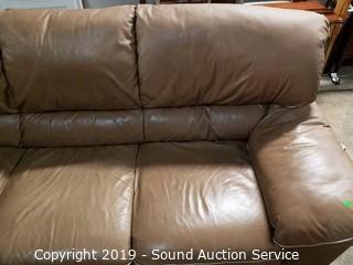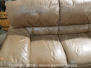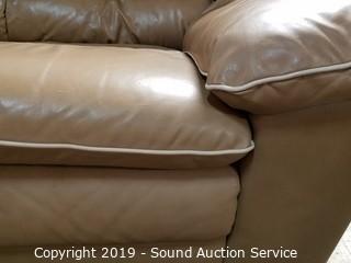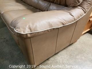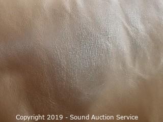 Item Description: Some wear on the headrest on the left side otherwise excellent condition. Light brown color with a beige trim accent. 34" H x 87" W x 34" D.