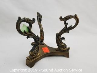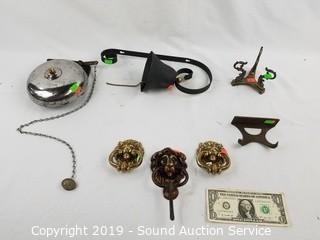 Item Description: One is cast iron with steel bell, 6-1/2" x 6". Other is 12" x 4". 3 heavy duty lion head brass pulls, & 2 brass stands.